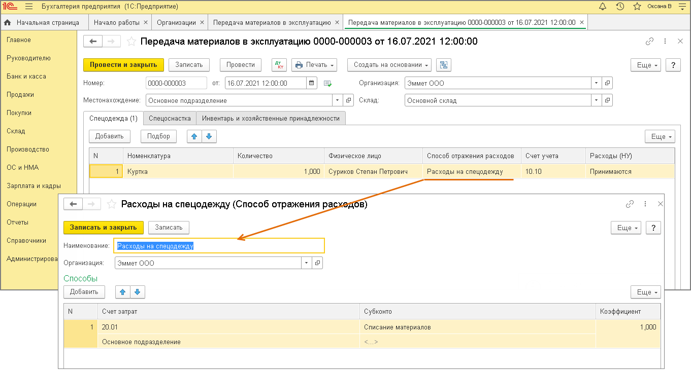 Найденная пошаговая инструкция по спецодежде дана для «1С:Бухгалтерия 8» ред. 3.0, релиз 3.0.96, а пример по реализации — для ред. 3.0, релиз 3.0.71. Если у вас интерфейс отличается, логику учета лучше сверять с вашим релизом: